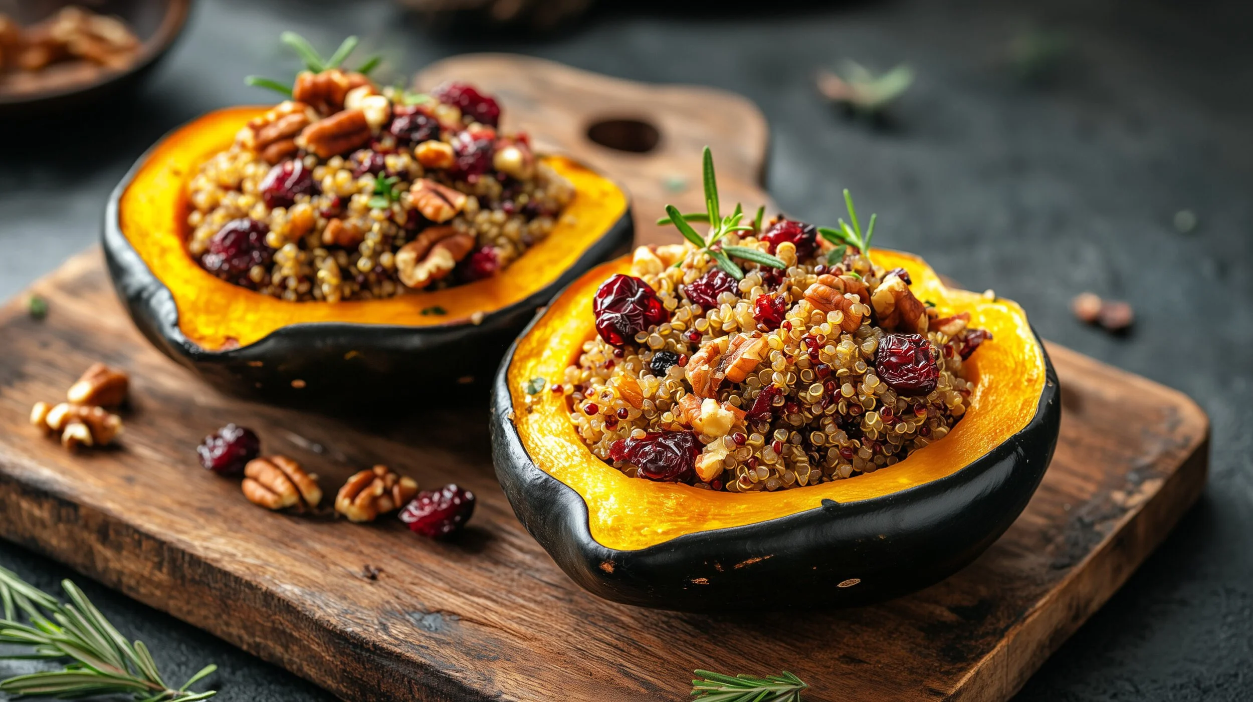 Fill the roasted squash halves with the quinoa mixture and warm in the oven before serving.